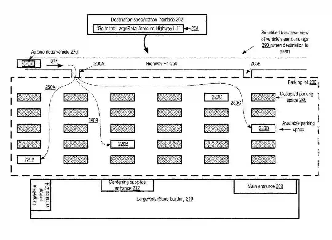 在这种情况下,汽车不仅仅是确定了最佳的停车位置,它首先解释了用户的陈述,并决定将车开到附近的"大型零售店"。另外,专利申请显示,这项专利相关的用户界面可以有一个下拉菜单,用户可以首先表示:“让我们去大型零售店"。然后可以有后续级别的菜单,让用户从在主入口附近停车,在园艺入口附近停车等选项中进行选择。或者,汽车可以简单地与用户直接交谈。