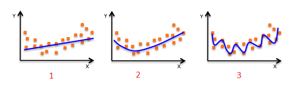 下图显示了对相同训练数据的三种不同拟合模型(蓝线标出),从中可以得出什么结论?