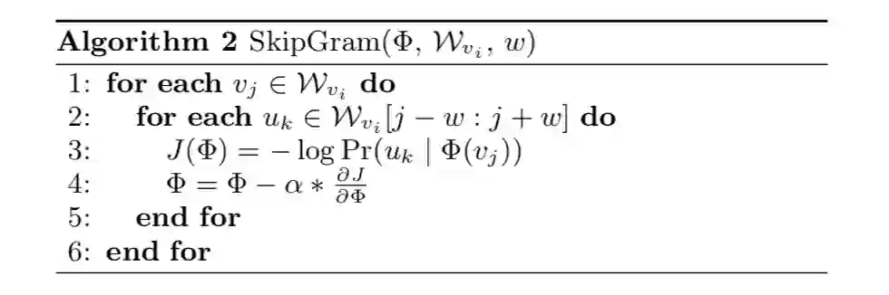 算法有两层循环,第一层循环采样 条路径,第二层循环遍历图中的所有结点随机采样一条路径并利用skip-gram模型进行参数更新。