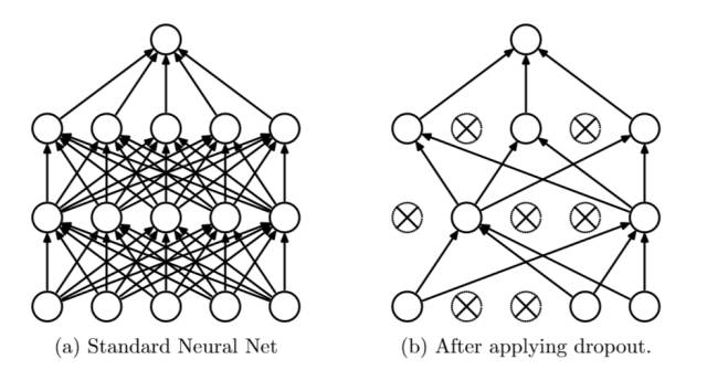 左边是标准神经网络,右边是使用Dropout的神经网络,可见只是连接度少了一些,并不影响模型继续训练。其实,Dropout动机和初衷非常有意思。