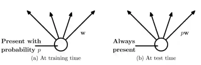 需要指出的是,在训练时,权重参数w是共享的。就是说,只要连接权重的神经单元不dropout,那么每次调参时,权重接着调整参数值。换句话说,权重参数个数和不用Dropout的神经网络参数个数是一样的。不同的是,见上图,在训练时,每个神经单元都可能以概率p去除;在测试阶段,每个神经单元都是存在的,权重参数w要乘以p,成为:pw。