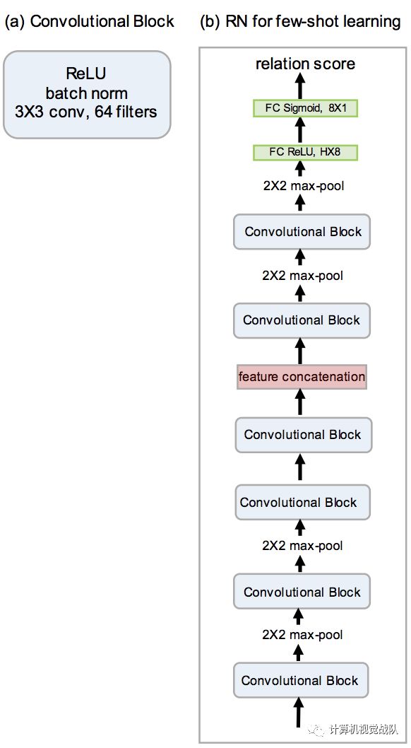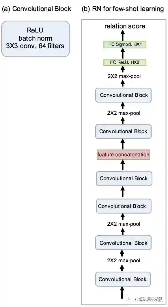 这样做是因为需要在关系模块中为进一步的卷积层提供输出特征映射。关系模块由两个卷积块和两个全连接层组成。每个卷积块为3×3卷积,64个滤波器,然后是批归一化、ReLU线性和2×2最大池化。
