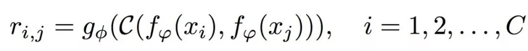 在本工作中,假设C(·,·)是深度特征映射的连接,尽管其他选择是可能的。将样本和查询的组合特征映射输入到关系模块g中,最终生成一个0~1的标量,表示xi和xj之间的相似性,称为关系评分。因此,在C-way的one-shot设置中,为一个查询输入xj和训练样本集示例xi之间的关系生成C关系评分ri,j。