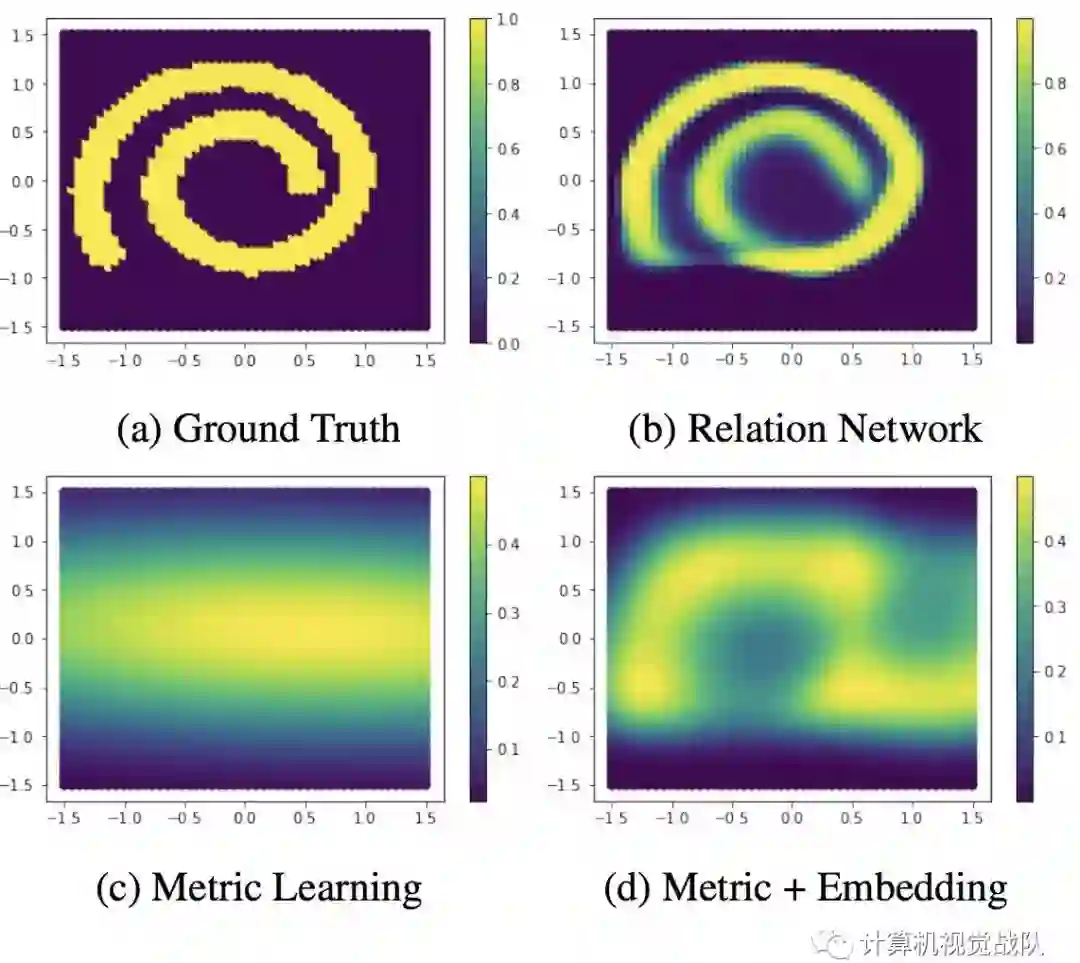 那么这种情况,其实传统的人为设计的度量方式就会失效。只能通过神经网络去学习这种度量。所以如下图这样复杂的螺旋曲线关系数据情况,可以通过RN可以学的不错。