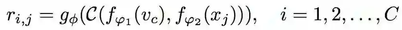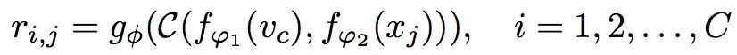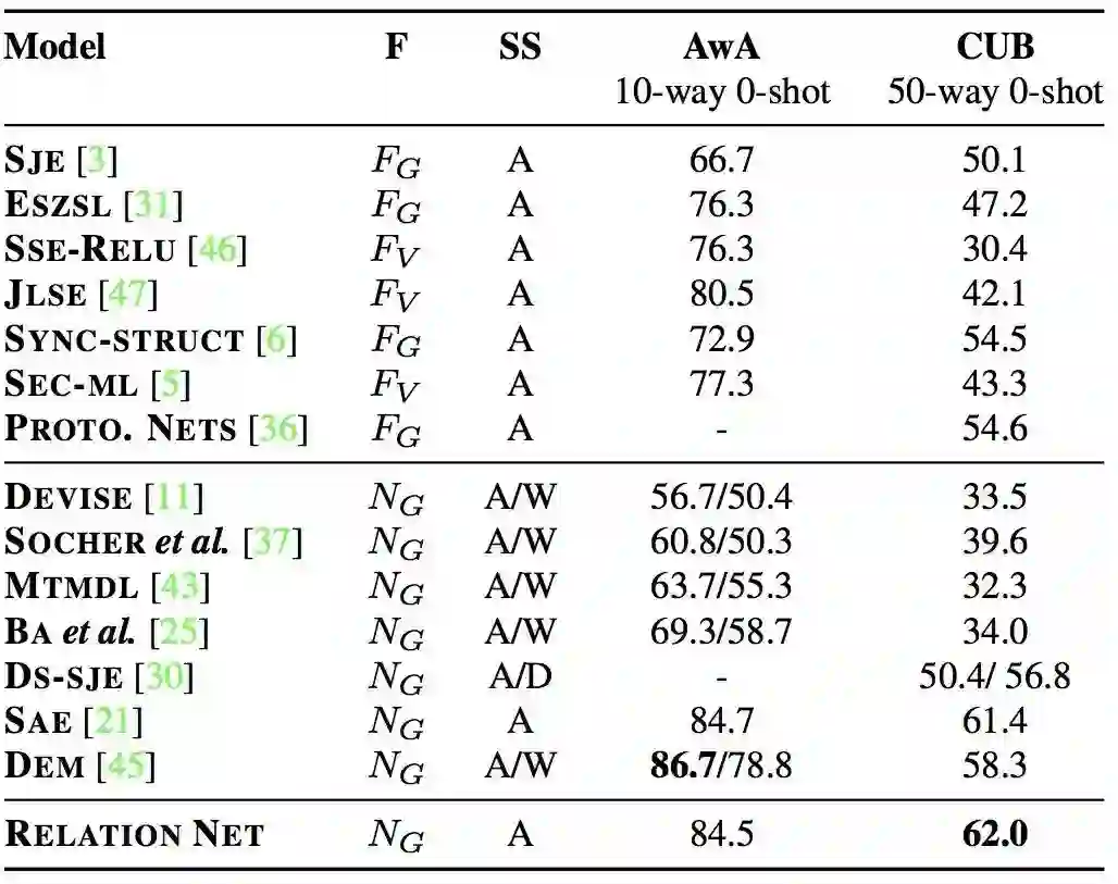 Zeao-shot学习类似于one-shot学习,它给出了一个数据来定义要识别的每一个类。然而,它没有为每个C类训练类别提供一张one-shot图像的支持集,而是为每个C类包含一个语义类嵌入向量Vc。修改提出的框架以处理one-shot的情况很简单:由于支持集使用了不同的语义向量形式(例如属性向量而不是图像),除了用于图像查询集的嵌入模块f1之外,还使用了第二个异构嵌入模块f2。在此基础上,应用关系网g。因此,每个查询输入xj的关系评分为: