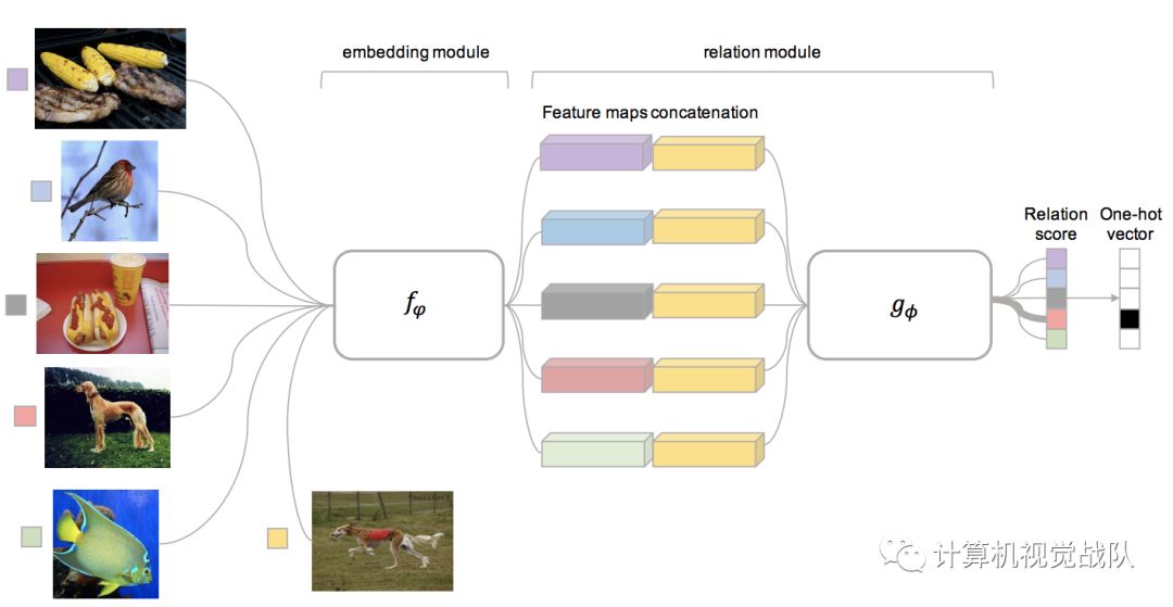 关系网络(RN)由两个模块组成:嵌入模块f和关系模块g,如下图所示。