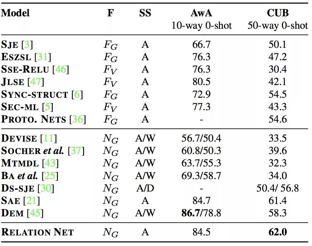 SS: semantic space; A: attribute space; W: semantic word vector space; D: sentence description (only available for CUB). F: how the visual feature space is computed; For non-deep models: FO if overfeat is used; FG for GoogLeNet; and FV for VGG net.