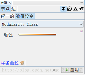 点击左上角外观中节点第一个选项卡,选择数值设定,选择Modularity Class,点击应用。