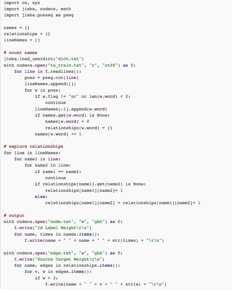 将已经建好的names和relationships输出到文本,以方便gephi可视化处理。输出边的过程中可以过滤可能是冗余的边,这里假设共同出现次数少于3次的是冗余边,则在输出时跳过这样的边。