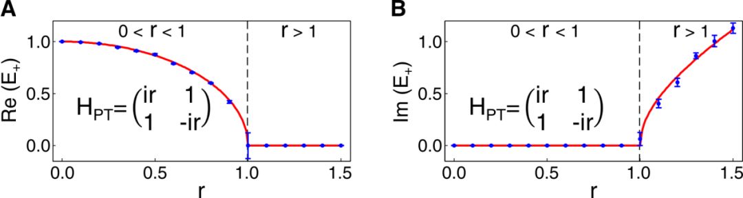 图:实验观测到宇称时间对称性破缺。A、B分别为宇称时间对称哈密顿量HPT本征能量E的实部和虚部。哈密顿量在其参数0<r<1的区域,宇称时间对称性未破缺,能量本征值为实数;在r>1的区域,宇称时间对称性破缺,能量本征值为虚数;r=1处为相变点。(图来源于《科学》文章正文)