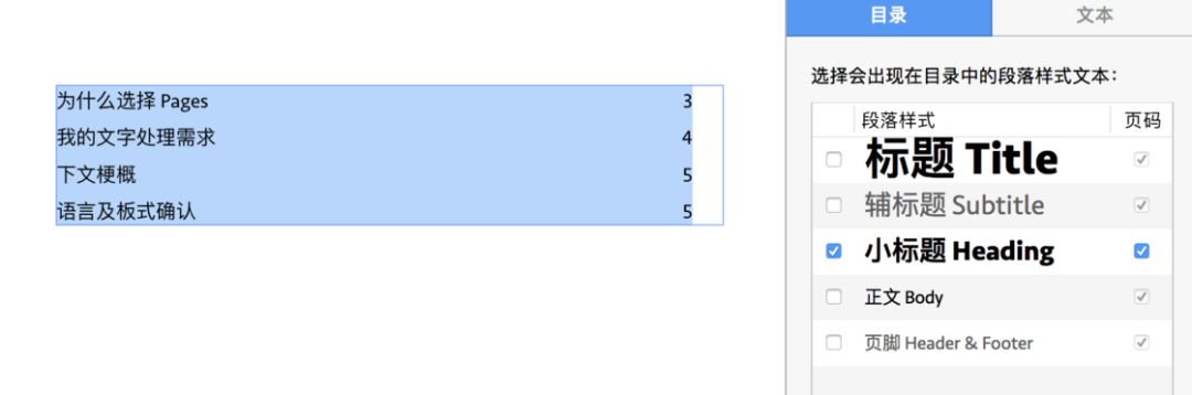 首先来说自动目录,Pages 会根据你想要取材的小标题等部分自动生成目录与相应页码。具体操作方式为:将鼠标光标放置在目录页开头,依次点击「插入 - 目录 - 文稿」。插入后选择目录的取材来源,参考范例中将以小标题为单位生成目录,点击「格式 - 目录」,勾选「小标题」。