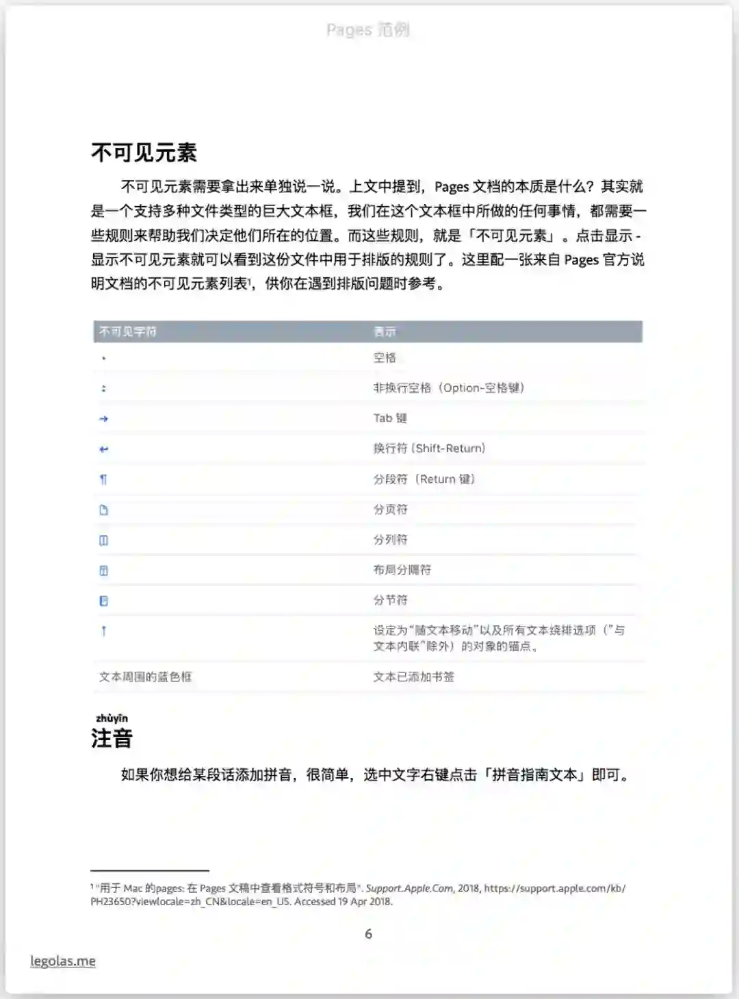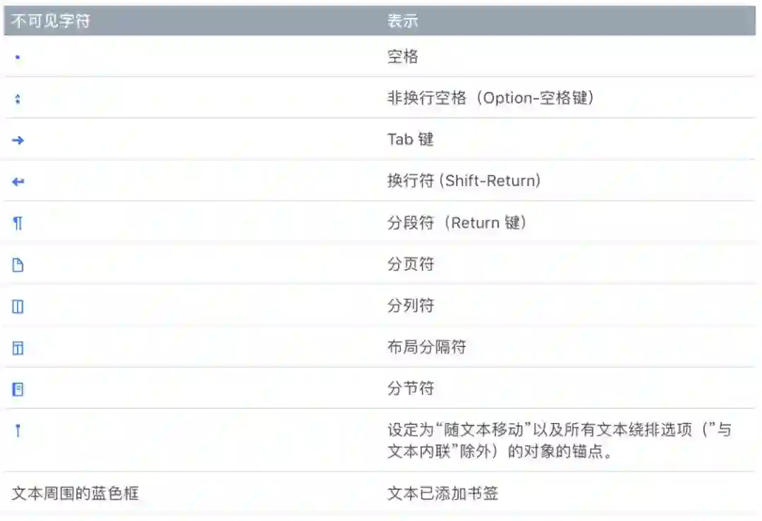 说完了处理模式,再来看看「不可见元素」。在 Pages 中所做的任何排版,都需要一些规则来决定各部分的位置,而这些规则,就是不可见元素。在使用 Pages 的过程中,若偶尔操作失误遇到排版异常,不用担心,依次点击「显示 - 显示不可见元素」就可以看到这份文稿中用于排版的规则了。下图来自 Pages 官方说明文档的不可见元素列表,供你在遇到排版问题时参考。