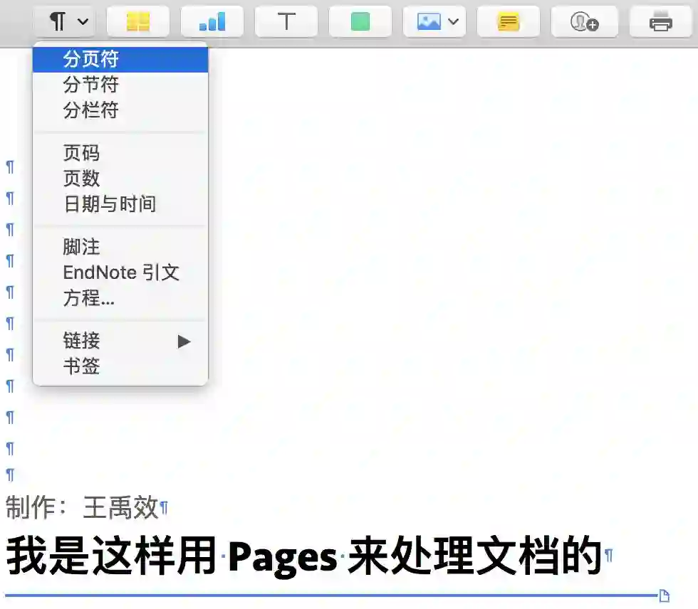 下图中我将不可见元素显示出来以供参考,你会发现最右下角有一个类似书页的小标示,就是刚刚插入的分页符。除分页符外,Pages 中还有分节符和分栏符,它们都是用来划分文章区域的重要工具。
