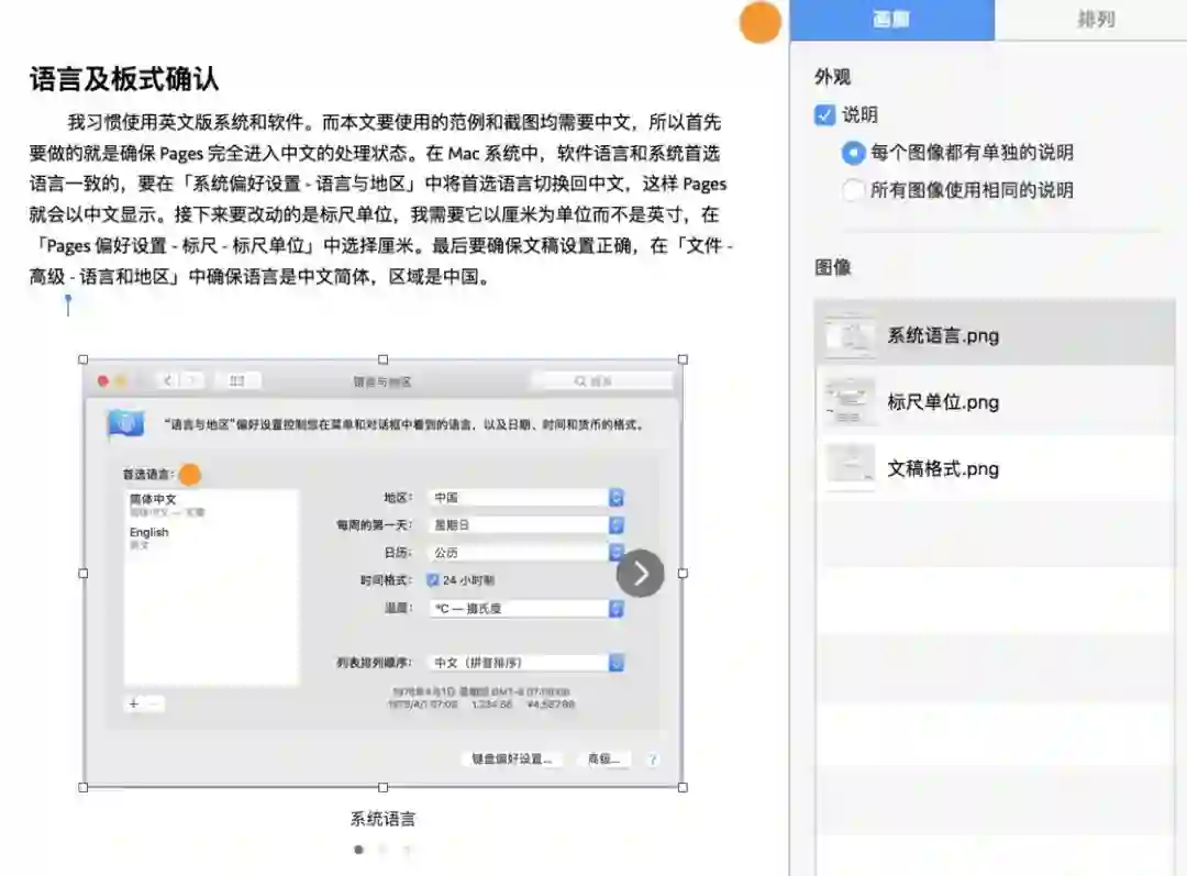 在排版时,我们常需要处理文字和图片间的排版关系,一般来说自动的文本绕排功能就已足够。但是在之前几篇 Pages 文章中有人反馈图片在文章中随意移动,这是因为图片尺寸太大在当页中放不下,Pages 自动寻找合适放置导致的。有两种方法解决这个问题,一是让它彻底停留在页面不要动,选中图片点击「停留在页面」即可;另一种方法是将这张图片绑定到相应文字上,让图片永远跟着这段绑定文字走,这就是「图文混排内联」。