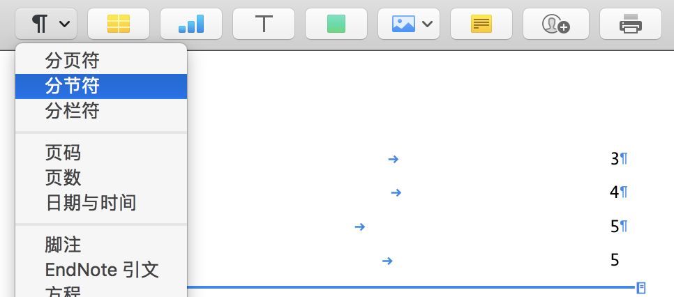 为了让目录和正文分别拥有独立的页码,你需要了解节的概念。一篇文章可以分为很多部分,若我们想对文章的某一区域进行单独设置,就需要把文章分成多个节。第一眼看到「节」很多人不理解它的意思,节在 Pages 中是一个区域划分的单位,一篇文章中可以有多个节,每个节都可以拥有自己的页码,页眉或页脚等设置。在范例文章中,我将目录和首页归类并设置为一个节,正文部分设置为另一个节,为它们单独提供页码。要做到这一点,只需要在目录结束的地方加一个分节符。