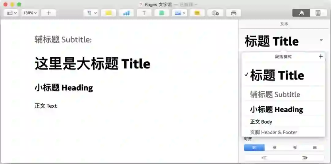 新建自定义模版的具体操作是:选择「空白」模版并创建文档,敲出一些预留文字如大标题,小标题,正文等,接下来按照你的喜好依次修改各部分文字样式并更新。值得注意的是,Pages 默认的空白模版有很多冗余段落样式,在使用中会有些混淆视听,你完全可以删除不需要的。