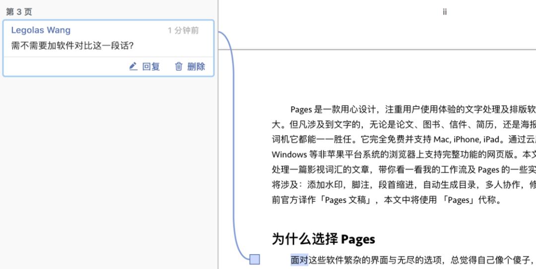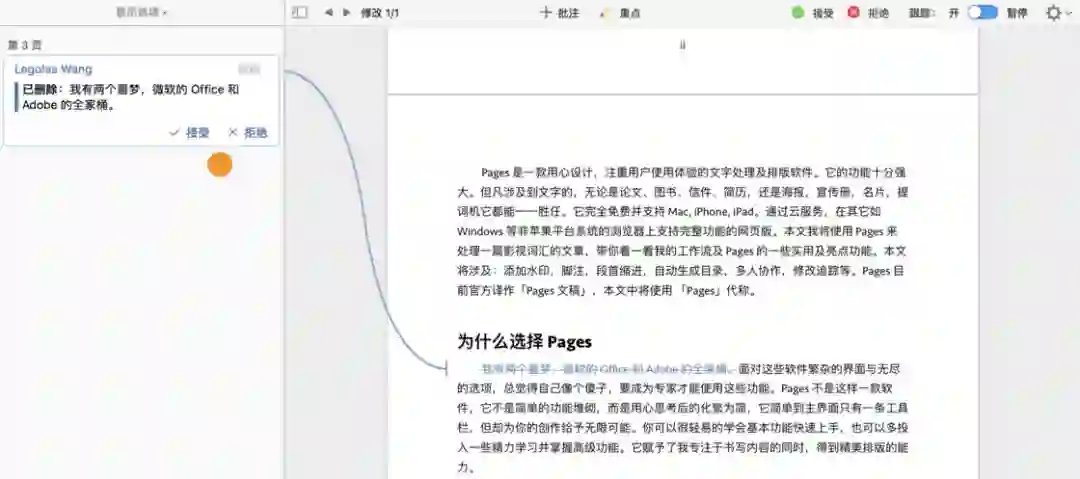 今天和以往不同的是,越来越多的时候,我们需要很多人同时编辑一篇文章。Pages 上有几个重要功能可以帮助你完成合作写作,比如修改追踪和批注。