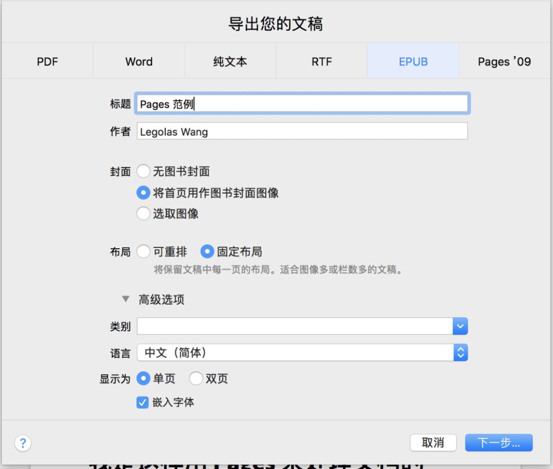 Pages 对 EPUB 格式的支持非常优秀。范例中,我使用了图片画廊,所以选择 EPUB 输出以正常显示这类多媒体类型。有些人认为 EPUB 只能输出动态自动排版,这是不正确的,EPUB 完全可以使用类似 PDF 的固定布局。本文中,我不希望自动布局重排破坏本文排版,因此选择「固定布局」。