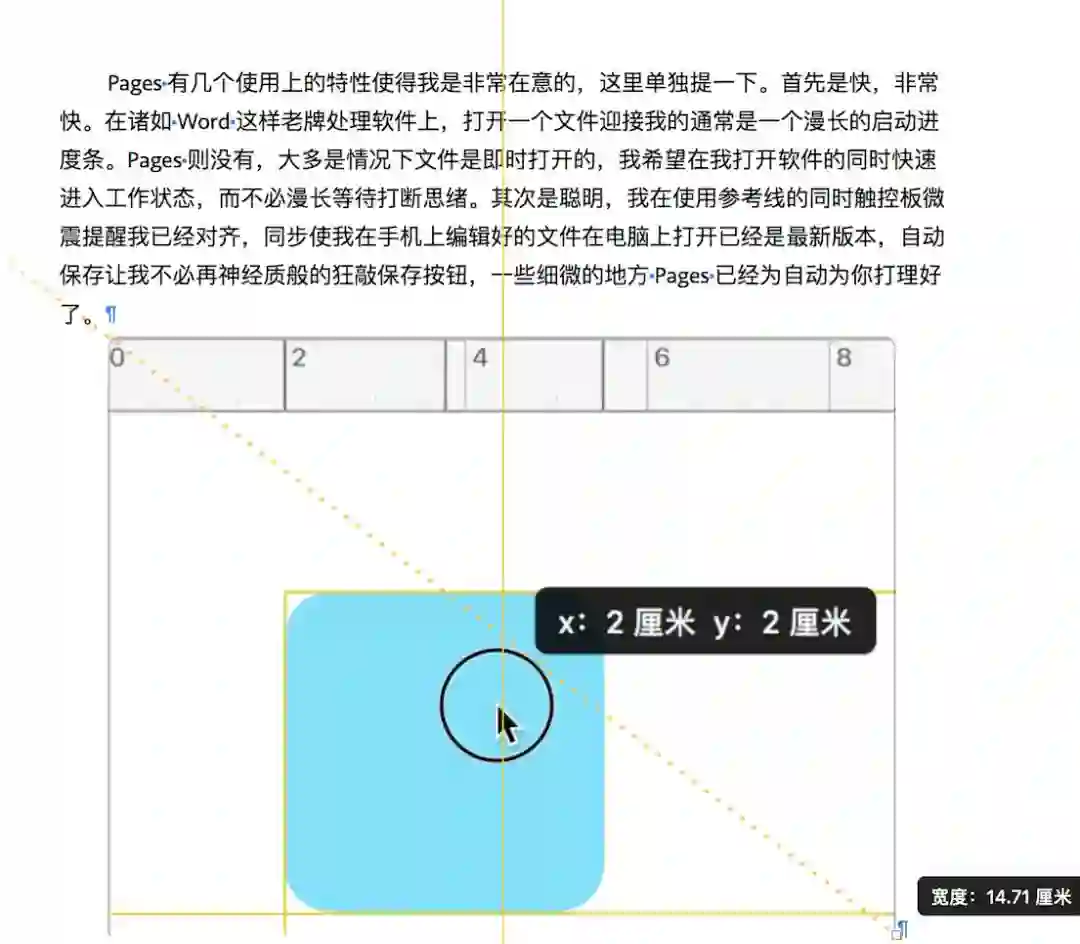 其次是细节处的用心,它会在你用参考线时让触控板微震提醒你对齐,用自动同步让你随时随地编辑,自动保存让你不再分心而专注文章本身,这些细微的地方 Pages 都为你自动打理好了。