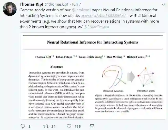 这篇由阿姆斯特丹大学的Thomas Kipf提出发表的ICML2018论文,神经关系推理(NRI)模型——交互系统神经网络关系推理,潜在交互图推断。