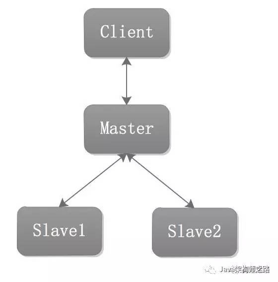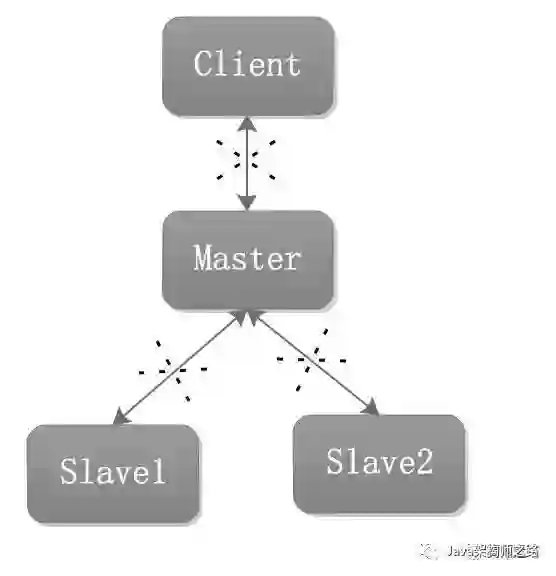 这是最常见的一种架构,一个Master节点,两个Slave节点。客户端写数据的时候是写Master节点,读的时候,是读取两个Slave,这样实现读的扩展,减轻了Master节点读负载。