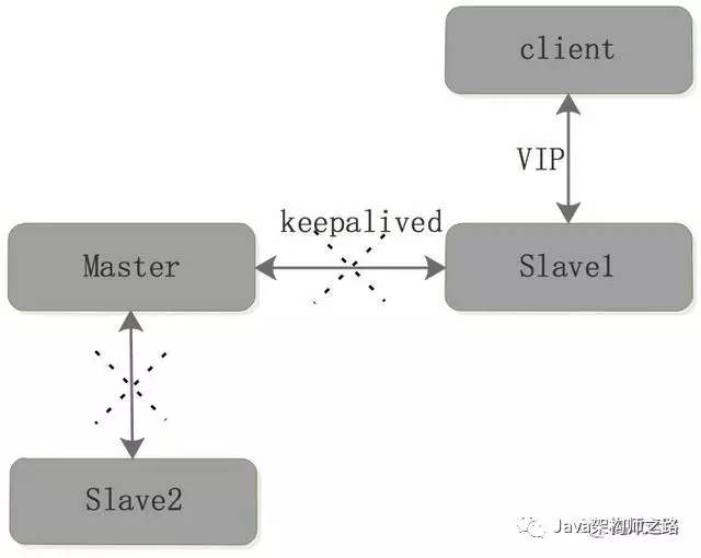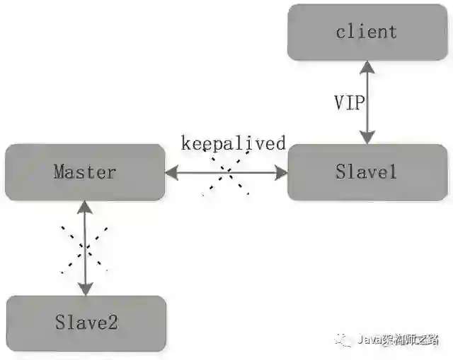 这种架构同样是一个Master和两个Slave。不同的是Master和Slave1使用keepalived进行VIP转移。Client连接Master的时候是通过VIP进行连接的。避免了方案一IP更改的情况。