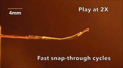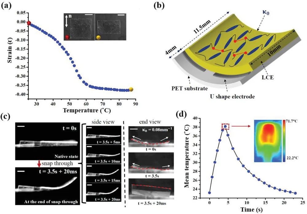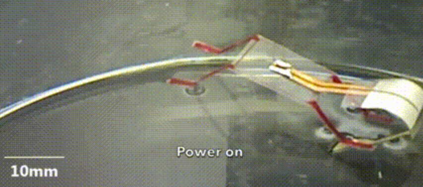 将液晶聚合物肌肉与与弯曲的聚对苯二甲酸乙二醇酯 (PET) 薄膜组合,聚合物相当于肌肉,薄膜相当于弹簧,再封装一个微型电极提供焦耳热,仅需不到几伏的电激活,关闭电源即可自动复位。