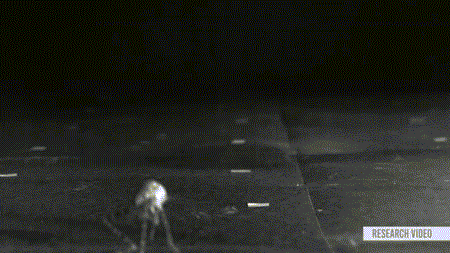 研究人员还制造了一种跳跃微型机器人,和蟋蟀大小差不多,可以通过致动前后脚,在砂砾中运动:
