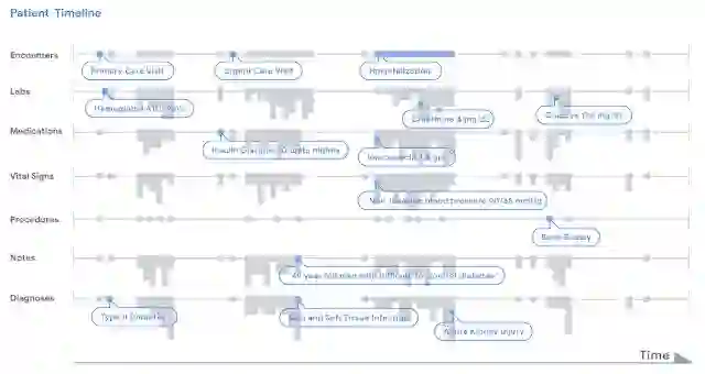 我们用时间线来展示患者电子病历中的数据。为方便说明,我们按行显示各种类型的临床数据,其中每个数据片段都用灰点表示,它们被存储在FHIR中。FHIR是一种可供任何医疗机构使用的开放式数据标准。深度学习模型通过从左往右扫描时间表,分析患者从图标开头到现在的住院信息,并据此进行不同类型的预测。