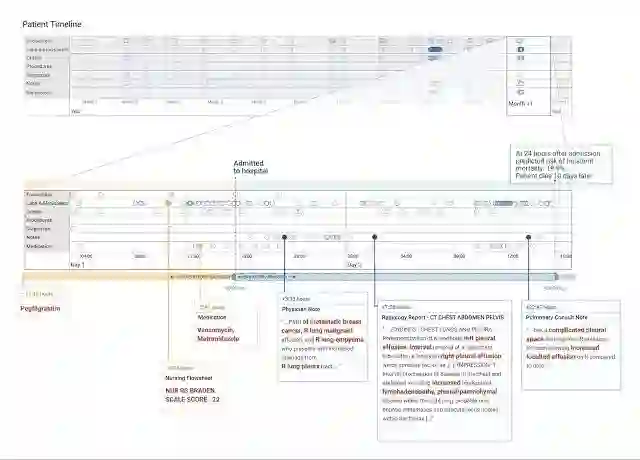 患者入院24小时后,我们使用深度学习进行预测。上图顶部的时间表包含了患者几个月时间的历史数据,我们将最近的数据做了放大显示。模型用红色标识了患者信息图表中用于“解释”其预测的信息。在这个研究案例中,模型标注了临床上有意义的信息片段。