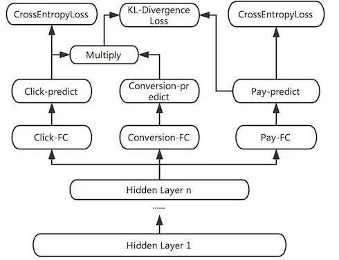 我们同时考虑到,不同的标签会带有不同的Noise,如果能通过物理意义将有关系的Label关联起来,一定程度上可以提高模型学习的鲁棒性,减少单独标签的Noise对训练的影响。例如,可以通过MTL同时学习样本的点击率,下单率和转化率(下单/点击),三者满足p(点击) * p(转化) = p(下单)的意义。因此我们又加入了一个KL散度的Bound,使得预测出来的p(点击) * p(转化)更接近于 p(下单)。但由于KL散度是非对称的,即KL(p||q) != KL(q||p),因此真正使用的时候,优化的是 KL(p||q) + KL(q||p)。