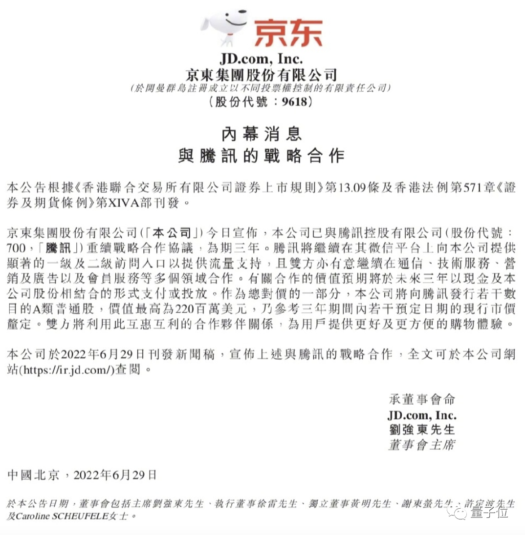 昨日晚间,京东在港交所发布公告称,已与腾讯控股重续战略合作协议,为期三年。