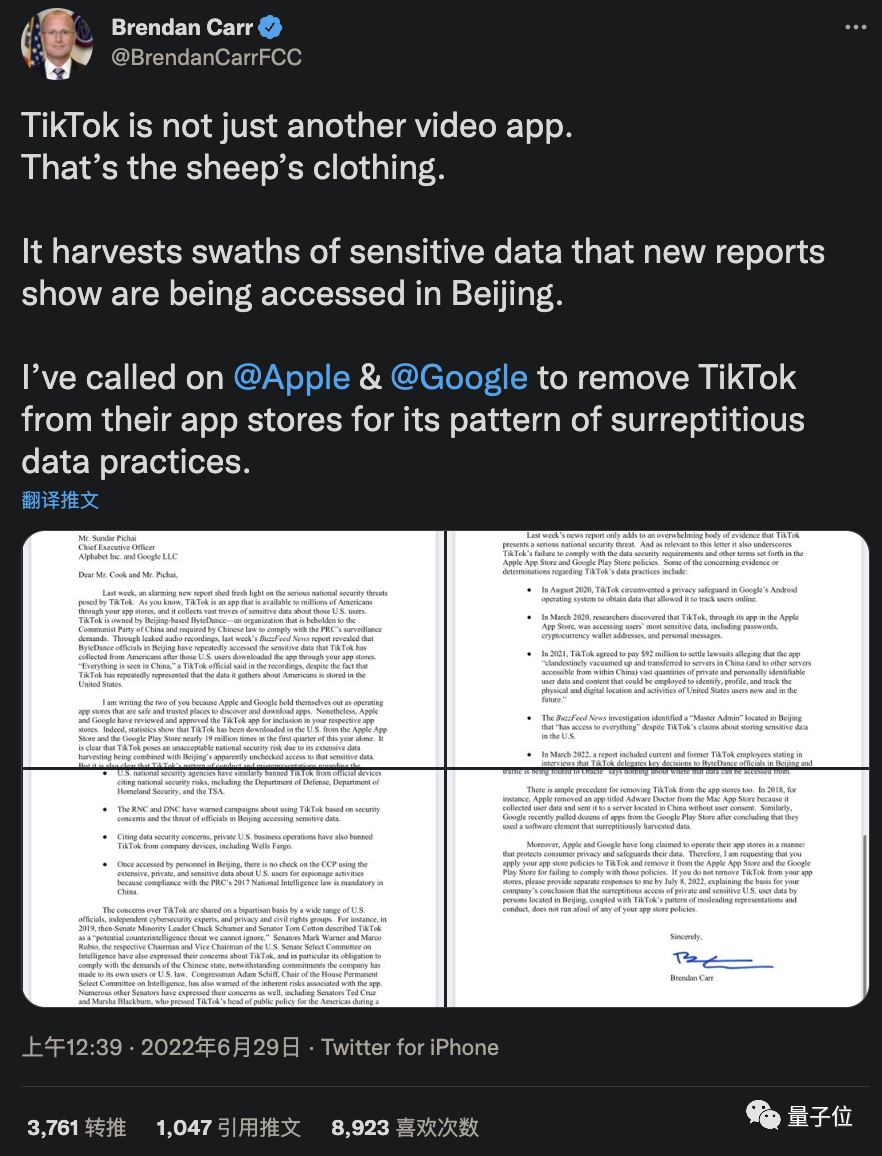 此外,他在信中还称,如果苹果和谷歌没有采纳这一建议,需要在7月8日前向他提供声明进行解释,包括证明TikTok商业模式并未违反任何应用商店政策。