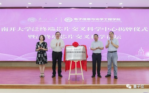 中国工程院院士、南开大学校长曹雪涛,以及学校科学技术研究部、电子信息与光学工程学院、人工智能学院负责人共同为泛终端芯片交叉科学中心揭牌。