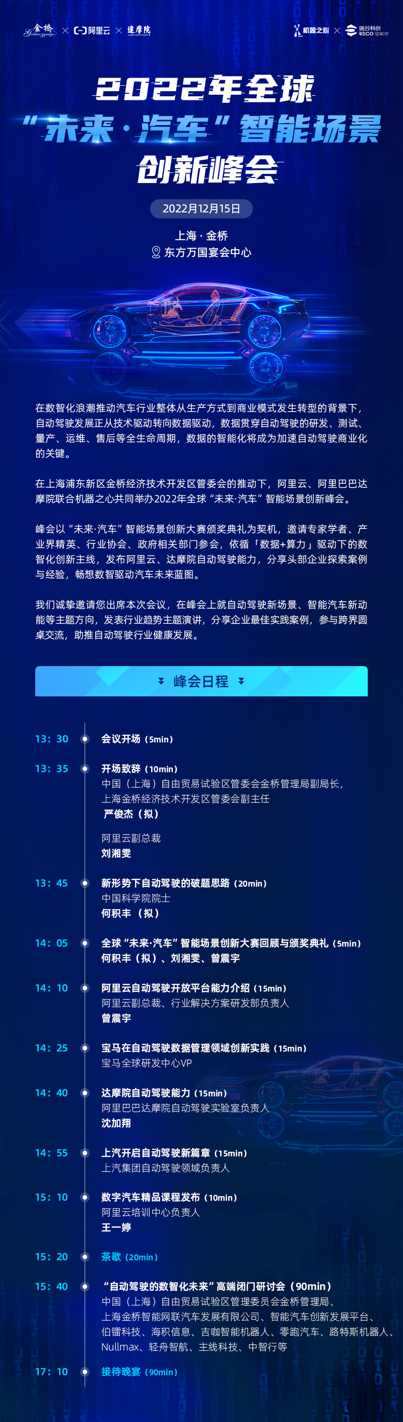 汽车云服务成为汽车从交通工具到 “智能移动终端” 的高效进阶途径。车企如何高效构建数据闭环系统,充分释放数据生产要素级潜能?如何高效处理大量数据,从采集、传输到存储的全生命周期?如何提升数据管理效能,实现降本增效?如何专注于构建核心竞争力,形成技术壁垒、赋能业务?聚焦上云新趋势,在上海浦东新区金桥经济技术开发区管委会的推动下,阿里云、阿里巴巴达摩院联合机器之心共同举办 2022 年全球 “未来 · 汽车” 智能场景创新峰会。