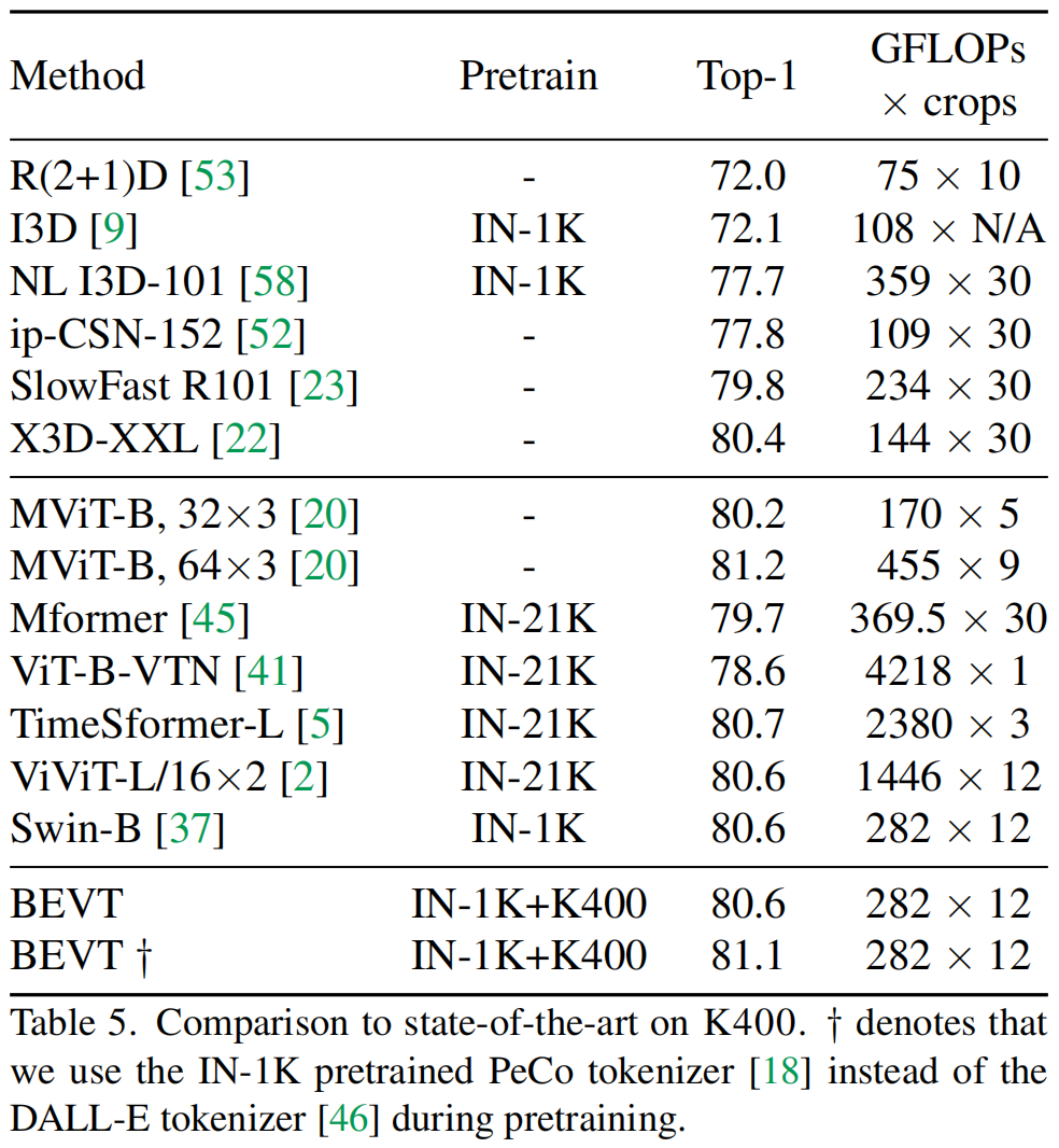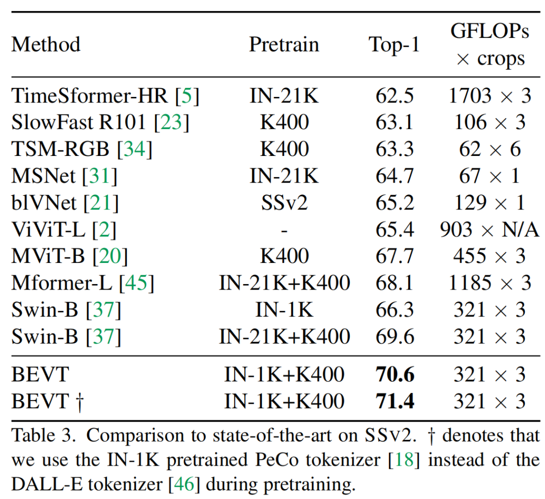 在与 SOTA 模型的比较中,可以看到,在 Something-Something v2 和 Diving48 上,BEVT 取得了明显比现有 SOTA 视频模型更好的性能;而在 Kinetics-400 上,BEVT 也取得了比计算量相近的 SOTA 模型更好或相当的性能。