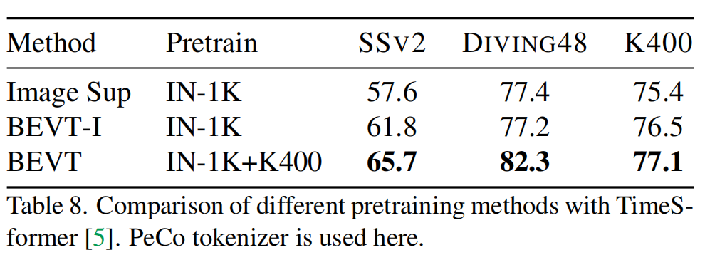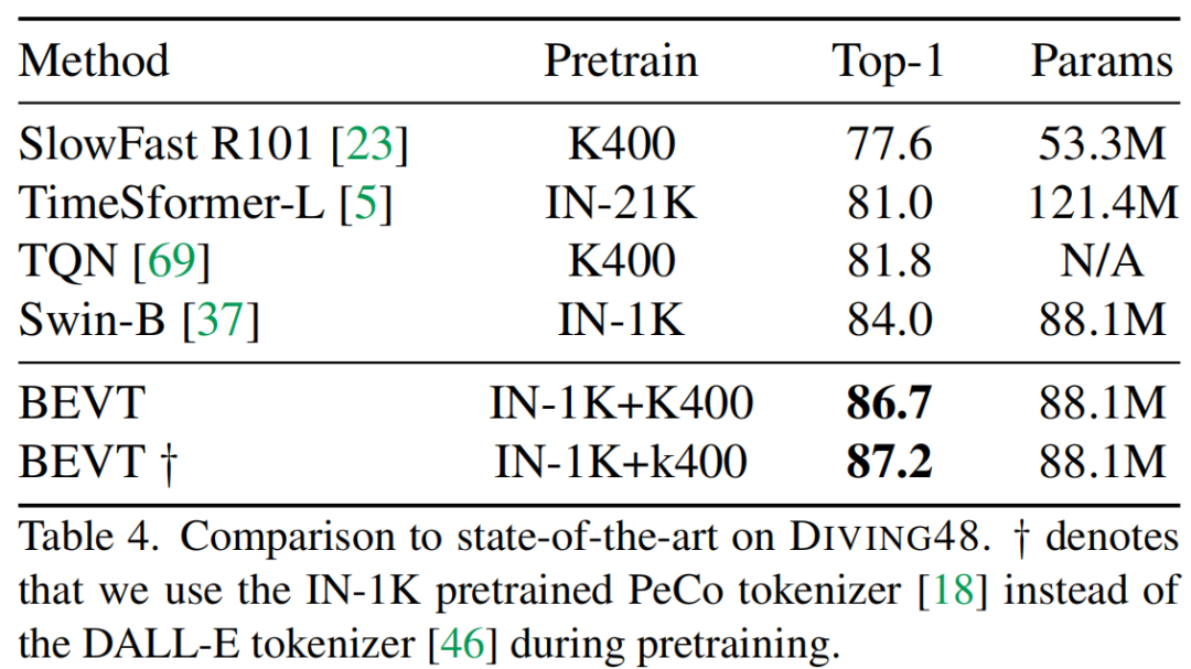 研究者发现,移除时间信息对 Kinetics-400 的预测结果影响较小,而对 Something-Something v2 和 Diving48 的预测结果影响相当大。这说明大部分 Kinetics-400 视频仅需通过空间信息线索即可被正确识别,而时间动态信息则对于 Something-Something v2 和 Diving48 视频的识别非常重要。因此,对于空间信息线索占主导地位的数据集(如 Kinetics-400),大规模图像数据集上的预训练便可带来可观的性能,额外的视频通路预训练对性能提升影响不大;而对于十分依赖时间动态信息的数据集(如 SSv2 和 Diving48),BEVT 中视频通路预训练的作用十分关键。