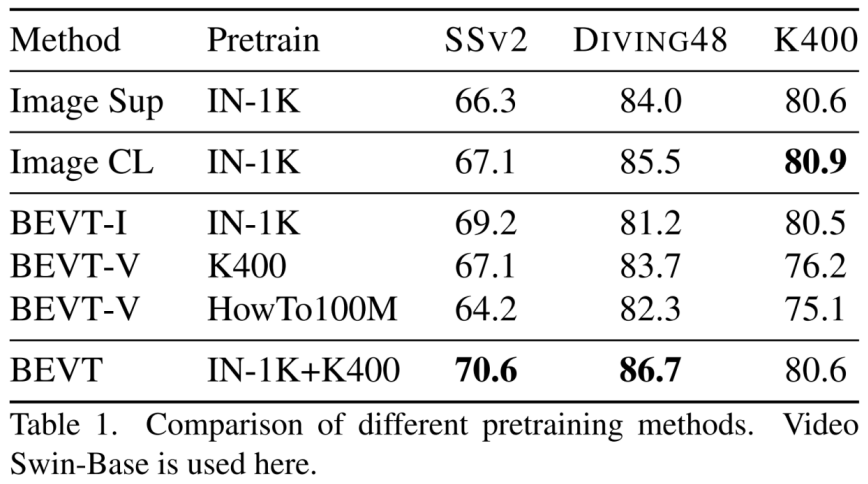 实验结果表明,BEVT 在 Something-Something v2 和 Diving48 上都要显著优于全监督预训练(Top-1 准确率分别高 4.3% 和 2.7%)和对比学习预训练,而在 Kinetics-400 上则取得了与 2 种 baseline 相当的结果。