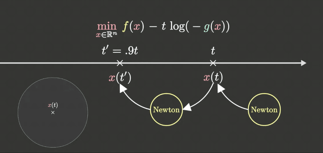 除了这篇3D教程之外,该博主还在另一个介绍凸优化的KKT条件和内点法的视频中,可视化了内点法是如何通过牛顿迭代逐渐得到最优解的: