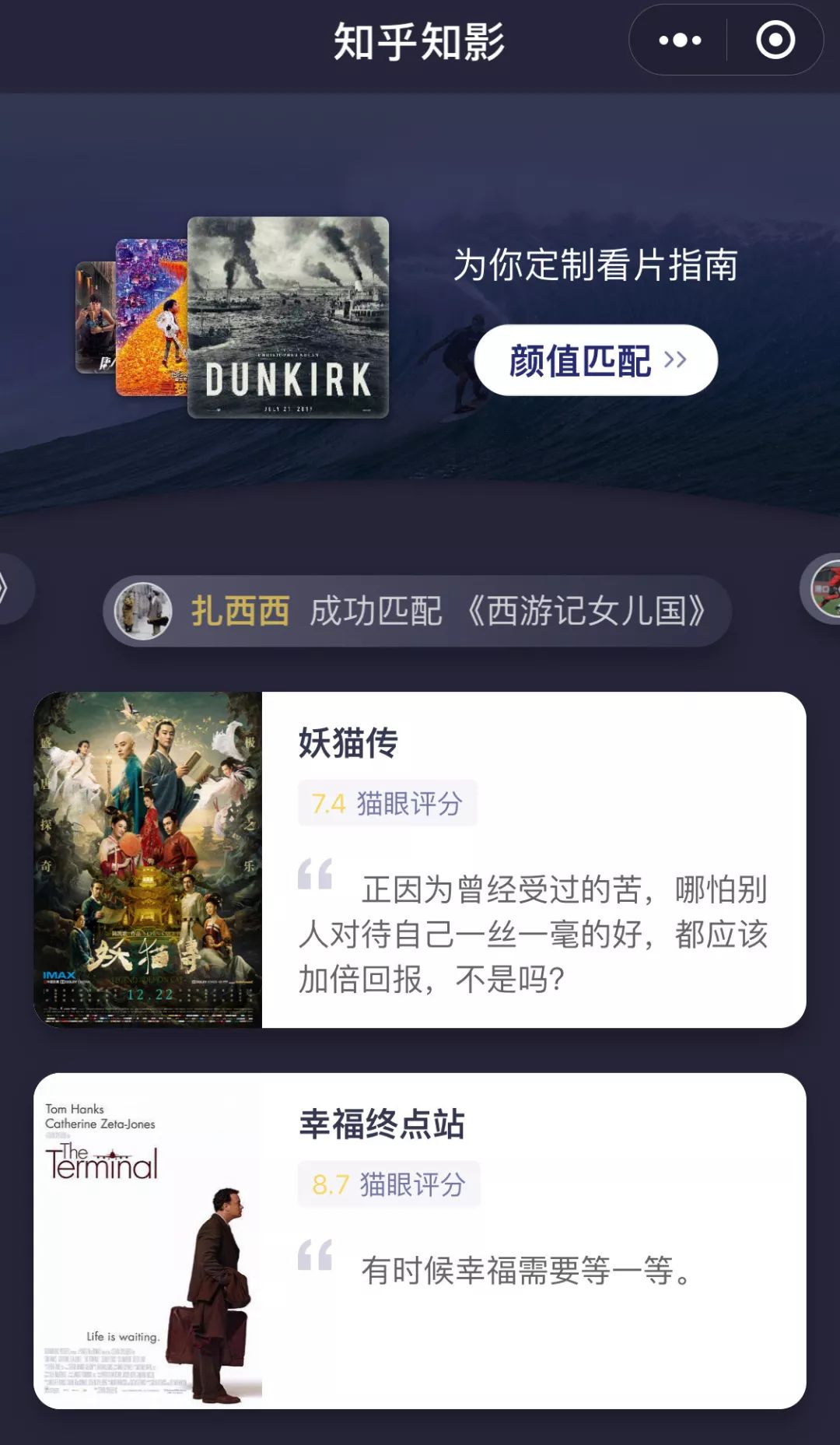 小程序叫“知乎知影”,用户可以通过“面部识别”或者上传个人照片,来获得与自身颜值相匹配的影片推荐。此外,用户可以直接查看推荐影片的详细信息;包含基本描述、IMDB 评分、用户点评等。还可获取知乎站内与影片相关,值得一看的精华讨论。