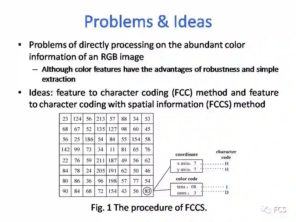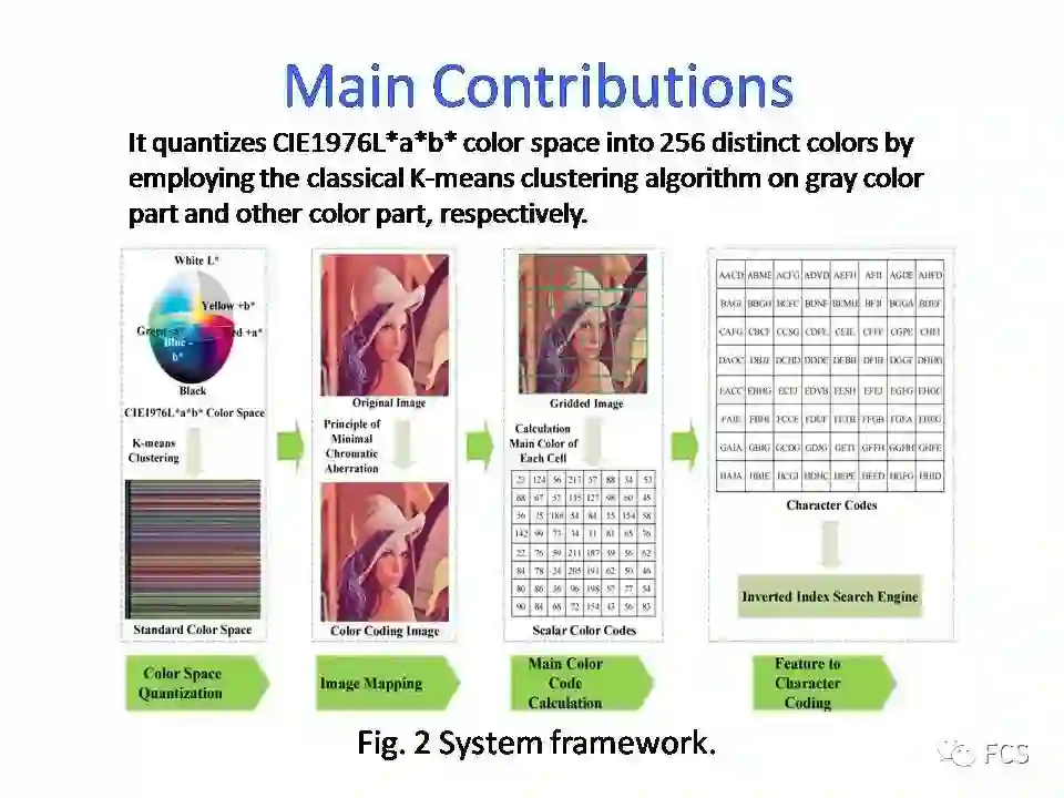此外,本文还提出了一种新的特征编码方法,称为feature-to-character coding (FCC),将基于分块的主颜色特征编码成字符代码。在该方法中,图像由字符代码表示,通过使用颜色特征和利用基于文本的搜索引擎,有助于高效地构建倒排索引。