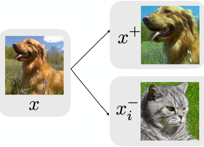以图像为例,见图2,对比学习期望通过使同一类狗不同角度照片的表示相近,而不同种类动物对应的表示距离相远,使得学到的表示可以忽略掉角度(或光影等)变换带来的细节变动,进而学习到更高维度、更本质的特征(语义)信息。