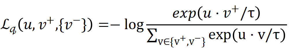 而InfoNCE, 又称global NCE, 在文献[14]中提出。InfoNCE继承了NCE的基本思想,从一个新的分布引入负样例,构造了一个新的多元分类问题,并且证明了减小这个损失函数相当于增大互信息(mutual information)的下界,这也是名字infoNCE的由来。具体细节这里不再赘述,感兴趣的读者可以参考这篇文章:http://karlstratos.com/notes/nce.pdf,里面有比较清晰的介绍与推导。我们直接看一下目前对比学习中常见的infoNCE loss形式: