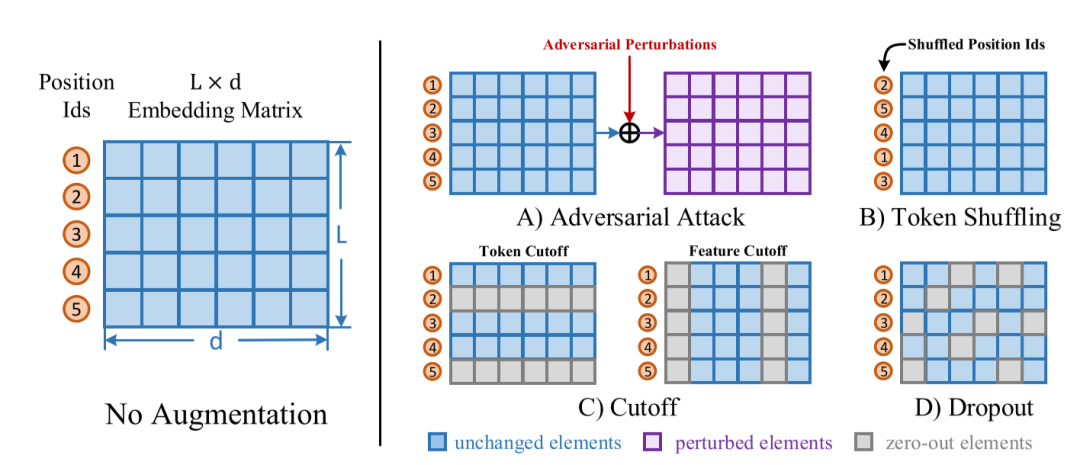 自然语言领域的扰动也大致可分为两类:词级别(token-level)和表示级别(embedding-level)。词级别的扰动大致有句子剪裁(crop)、删除词/词块(span)、换序、同义词替换等。表示级别的扰动包括加高斯噪声、dropout等。见图5。