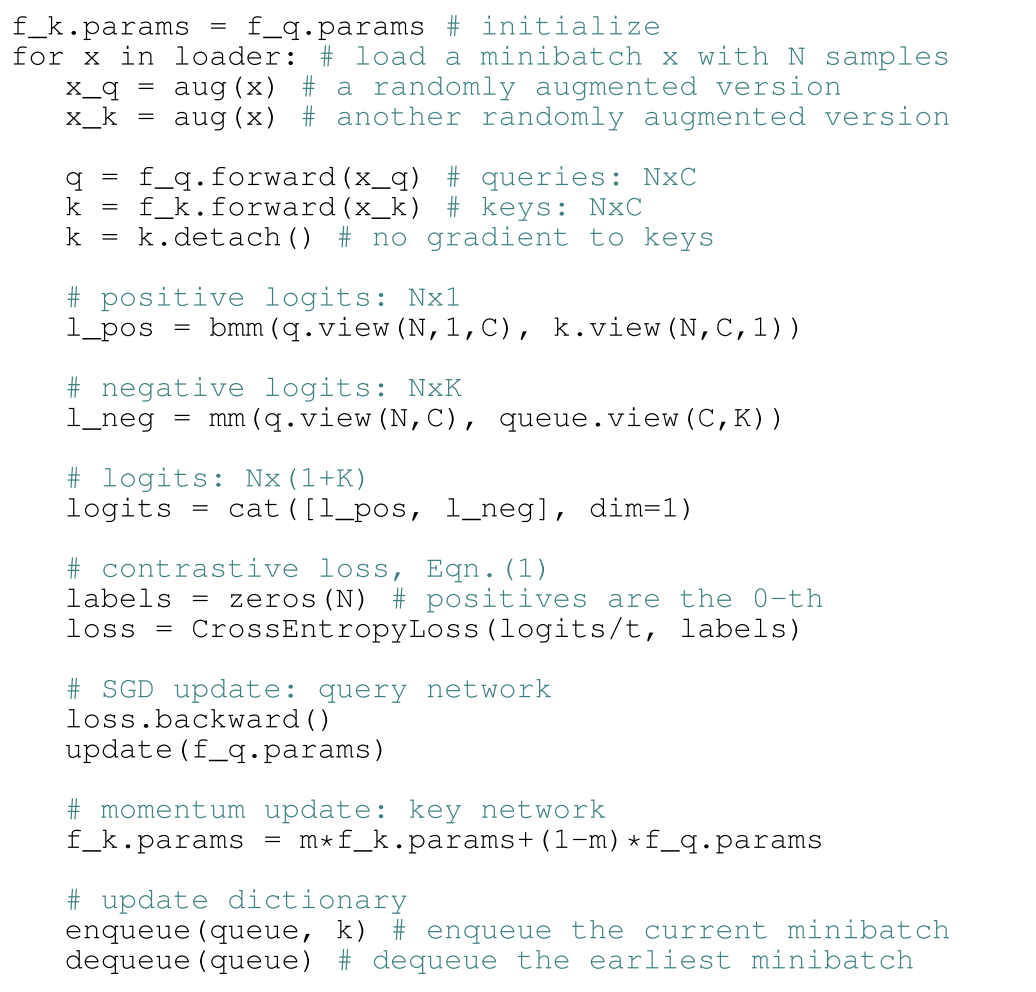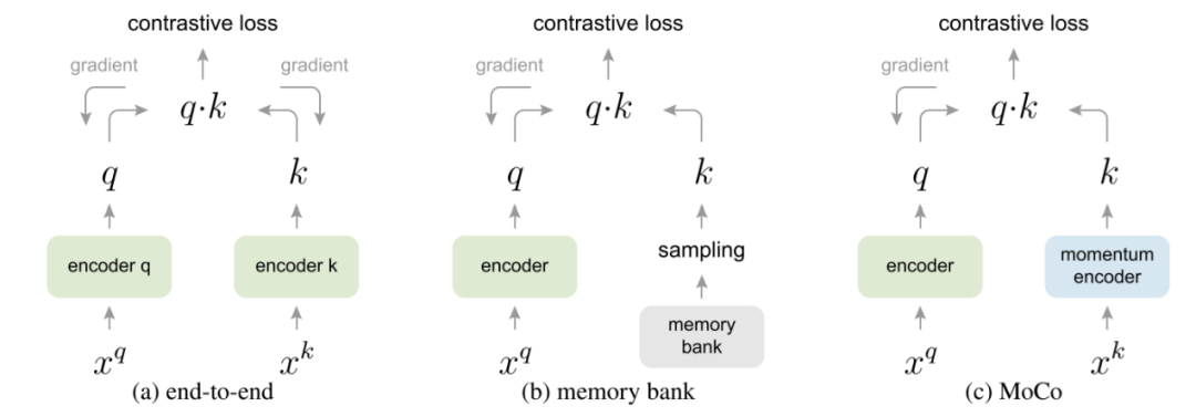 Memory Bank顾名思义,在开始训练之前,先将所有图片的表示计算好储存起来,叫做memory bank。Bank中的表示将作为负例的表示参与构建对比损失,每次迭代更新参数后,当前batch中样例对应的memory bank中的表示将会用更新后的参数更新,以这样的方式慢慢更新memory bank中的样例表示。这种方式就不需要对大量负样例做前馈和反向传播运算,大大降低了运算量。但是这种方式有两大缺点:1、当样例数目很大时,需要占用极大的内存。2、样例迭代太慢,由于不同步更新的表示对应的表示函数不同,第一步batch更新的表示和第10000步batch更新的表示对应的函数参数可能差别非常大,造成了不一致的情况,那这两种表示进行对比会有很大的噪声。MoCo则借鉴强化学习的一些工作,引入了动量更新来解决这一问题。