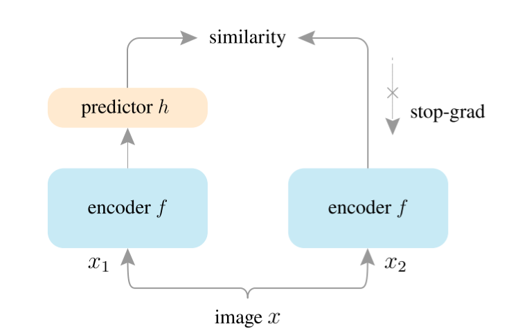虽然BYOL强调动量更新对构造非对称结构避免表示塌缩非常重要,但SimSiam证明了真正重要的并不是动量更新,而是在于不求导操作。SimSiam的结构同BYOL基本一样,见图14,encoder由ResNet和一映射头组成。