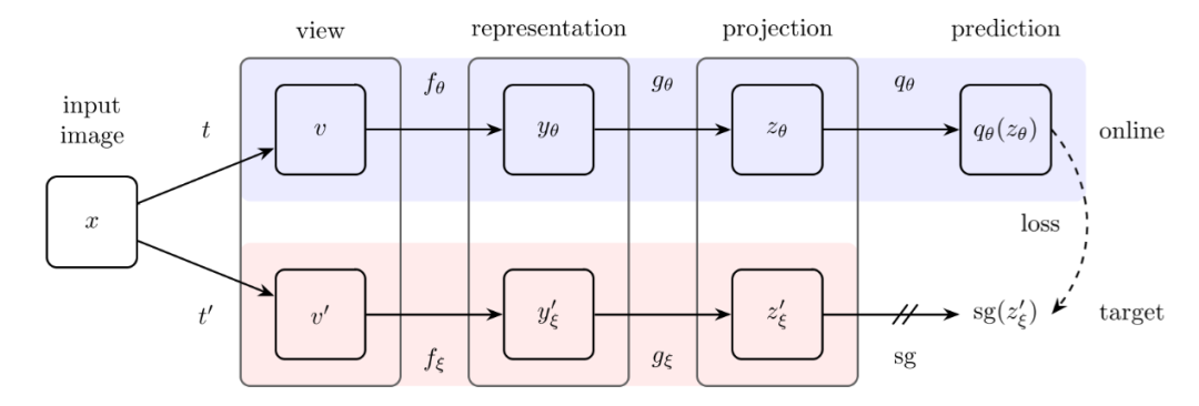 BYOL的结构非常简单,与MoCo非常相似,也应用了动量更新。见图13,BYOL用了非对称的孪生网络,原文分别称为在线网络(online network)和目标网络(target network)。