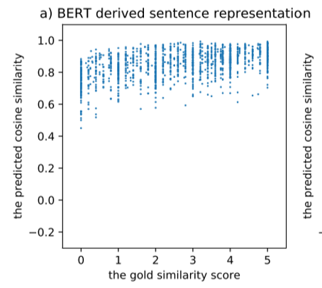 我们都知道,通过以Bert为代表的预训练模型得到的词表示在广泛的下游任务上都取得了非常不错的表现,但是句子表示(无论是用[CLS]特殊字符还是平均池化得到)的表现远不如词表示这么亮眼。文献[17]指出,通过Bert学到的词表示根据词频呈现不均匀分布,高频词离原点更近且彼此间距离更近,低频词离原点更远且更稀疏,因此平均后高频词对最终句表示的影响更大,导致Bert学到的句表示对语义变化不敏感,如图15,横坐标为文本语义匹配数据集中对句子相似度的人工评分,纵坐标为对应的Bert句向量得到的相似度评分,会发现Bert句向量并不能很好的区分语义相近和语义不相近的句子,而对比学习通过告诉模型拉远负例间的举例,很好的解决这个问题。