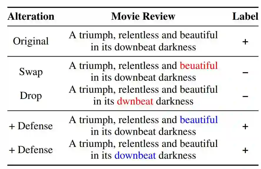 与图像领域一样,有进攻就会有防御,目前也有很多研究尝试构建更鲁棒的自然语言处理模型。例如在 CMU 的一篇对抗性拼写错误论文(arXiv:1905.11268)中,研究者通过移除、添加或调序单词内部的字符,以构建更稳健的文本分类模型。这些增减或调序都是一种扰动,就像人类也很可能出现这些笔误一样。通过这些扰动,模型能学会如何处理错别字,从而不至于对分类结果产生影响。