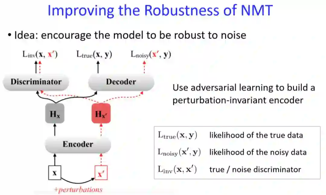 刘洋老师表示,目前比较多的方法是在训练中加入噪声而让 NMT 模型学会抵御随机扰动。如下图所示,X 是正确的输入,会加一些噪声以形成 X'。当我们用神经网络进行学习的时候,会生成两种内部表示 H_x 和 H_x'。我们希望这两种内部表示对于判别器 Discriminator 是不可区分的,如果不可区分,就说明噪声不会对预测做出更大的影响。